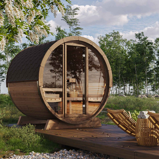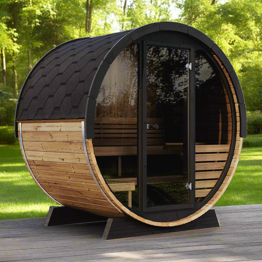 SaunaLife ERGO Series E7G | 4 Person Outdoor Barrel Sauna with Full Glass Front